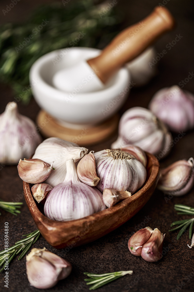 Fresh garlic with rosemary on wooden background. Garlic bulbs