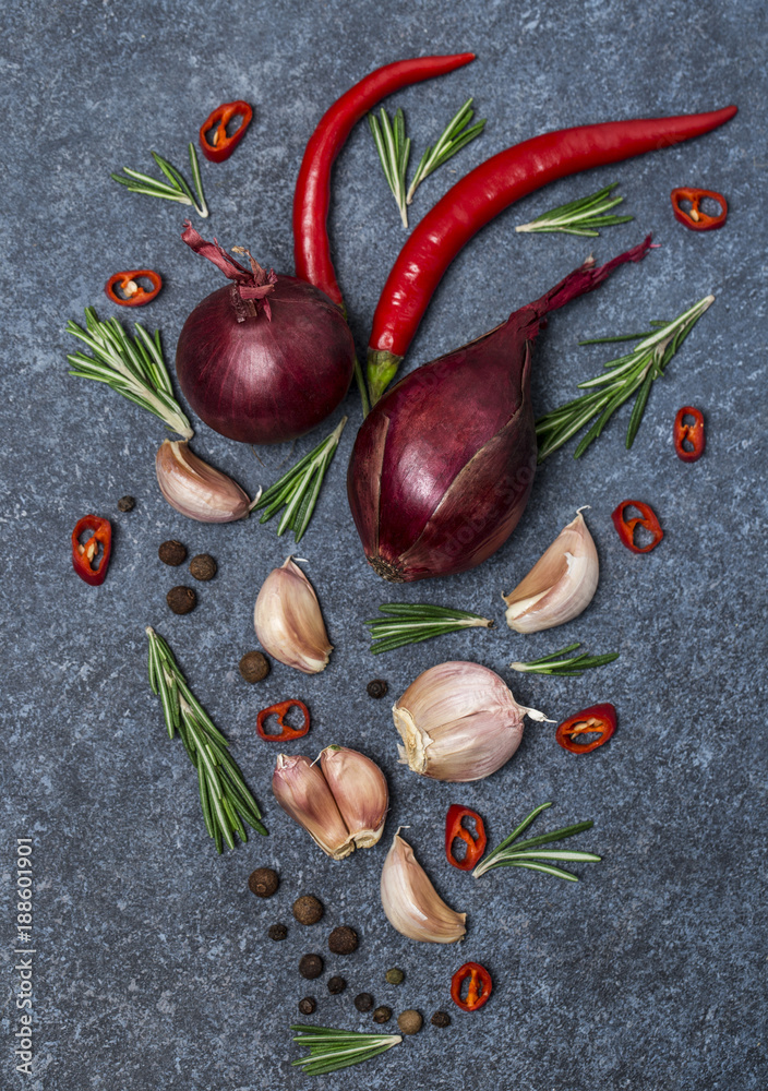 Fresh garlic with chili pepper, red onion and rosemary on wooden background