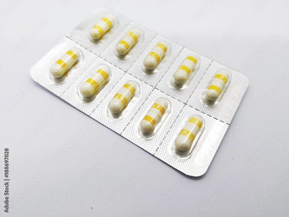 Medication concept. Celecoxib is a nonsteroidal anti-inflammatory drug , white-yellow capsules are in silver blister. Selective focus, Isolated on white background and copy space.