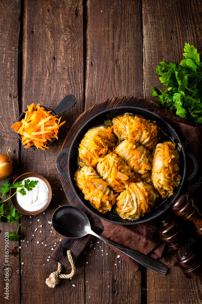 Cabbage rolls stewed with meat and vegetables in pan on dark wooden background, top view