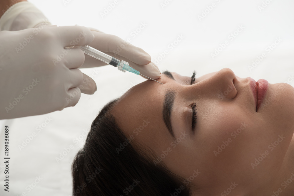 Close up of surgeon hand injecting botox into female forehead. Asian woman closed eyes with serenity
