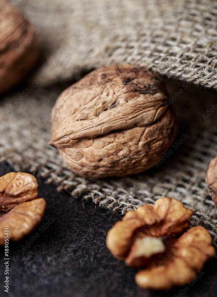 Walnuts. Walnut kernels and whole walnuts on rustic table.