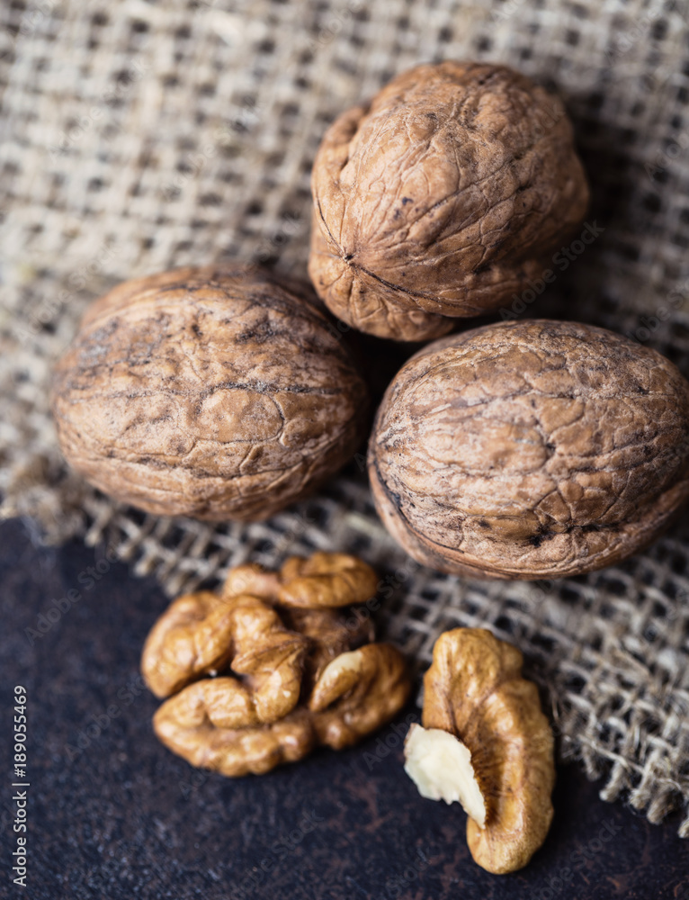 Walnuts. Walnut kernels and whole walnuts on rustic table.