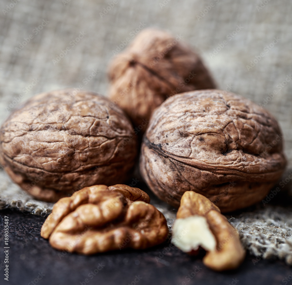 Walnuts. Walnut kernels and whole walnuts on rustic table.
