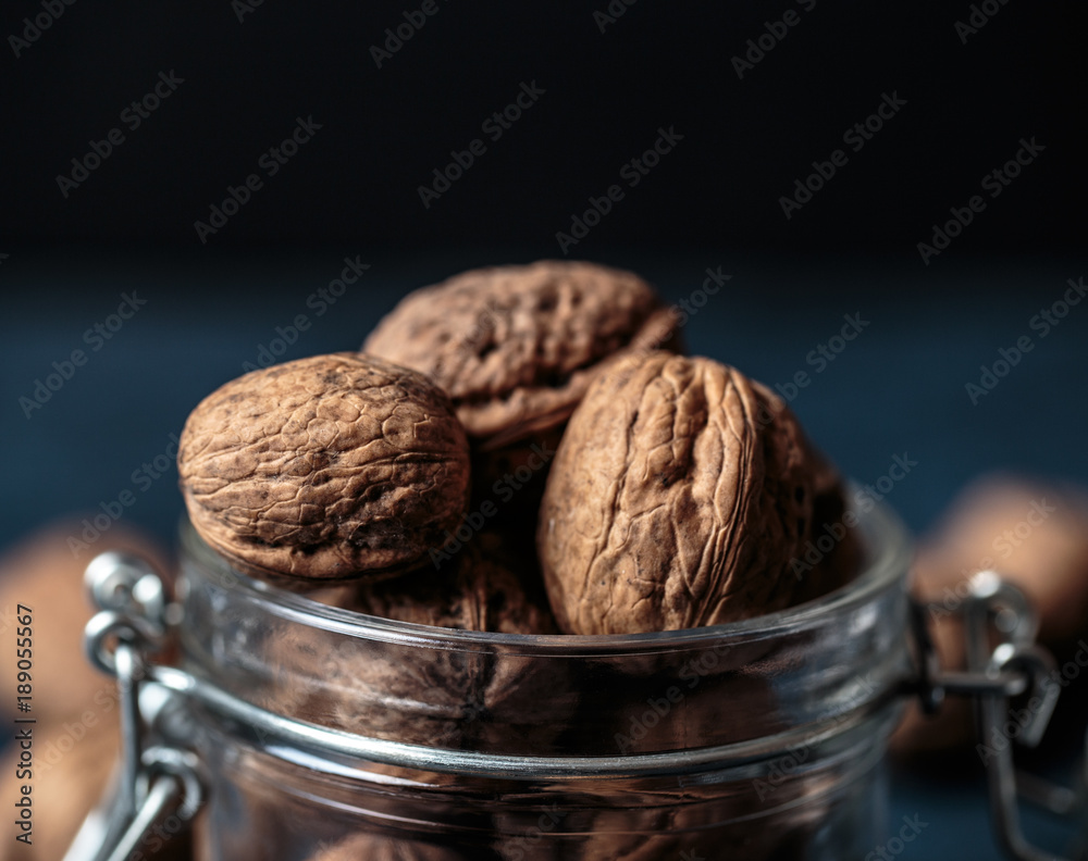 Walnuts. Walnut kernels and whole walnuts on rustic table.