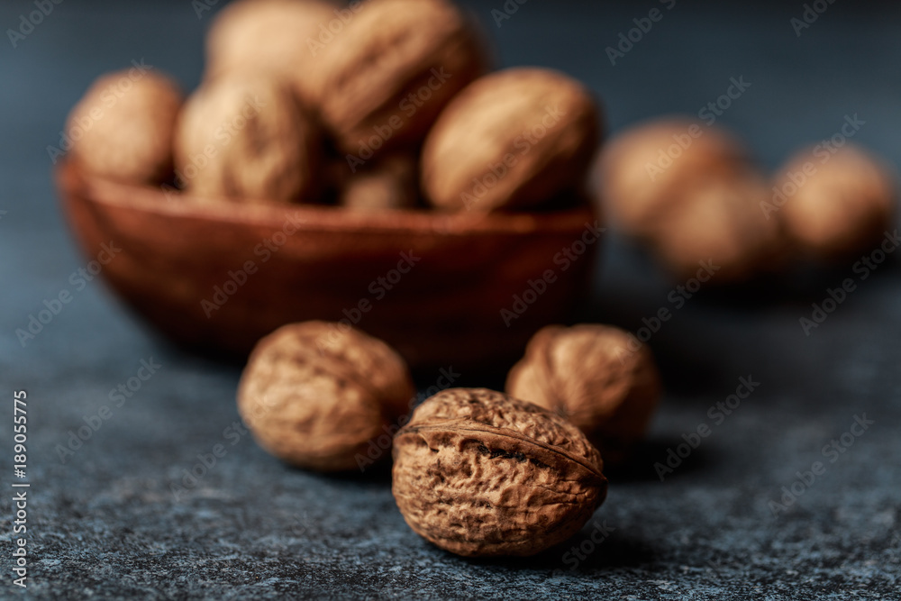 Walnuts. Walnut kernels and whole walnuts on rustic table.