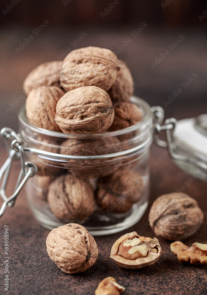 Walnuts. Walnut kernels and whole walnuts on rustic table.