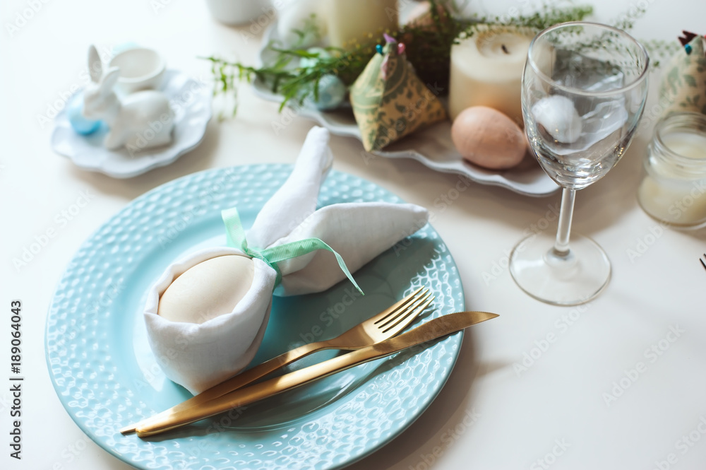 easter festive table. Guest dining place decorated with bunny napkin and egg, golden metalic cutlery and blue plate