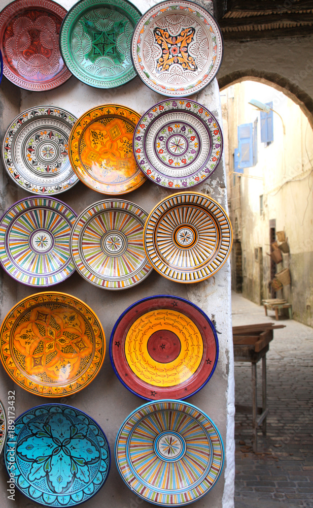 Traditional moroccan souvenirs on souk in Essaouira, Morocco, Africa