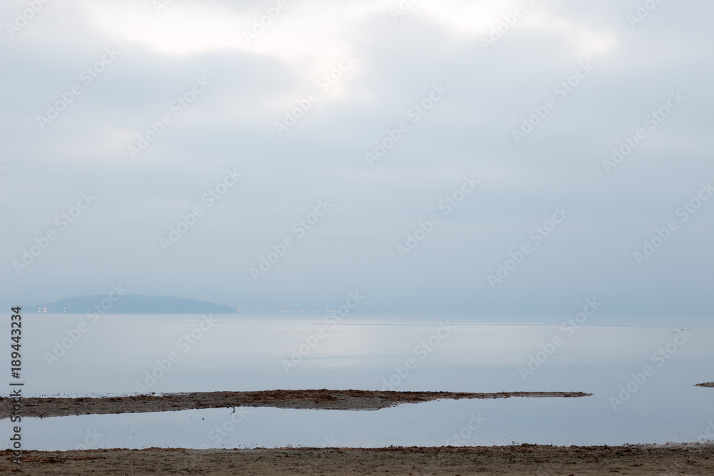 Minimalistic view of Trasimeno lake shore at dawn with soft hues