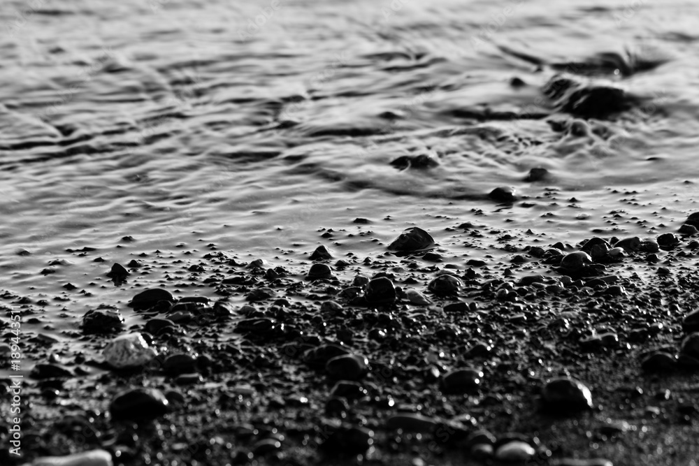 A close view of water on a lake shore, with details of sands and little round stones