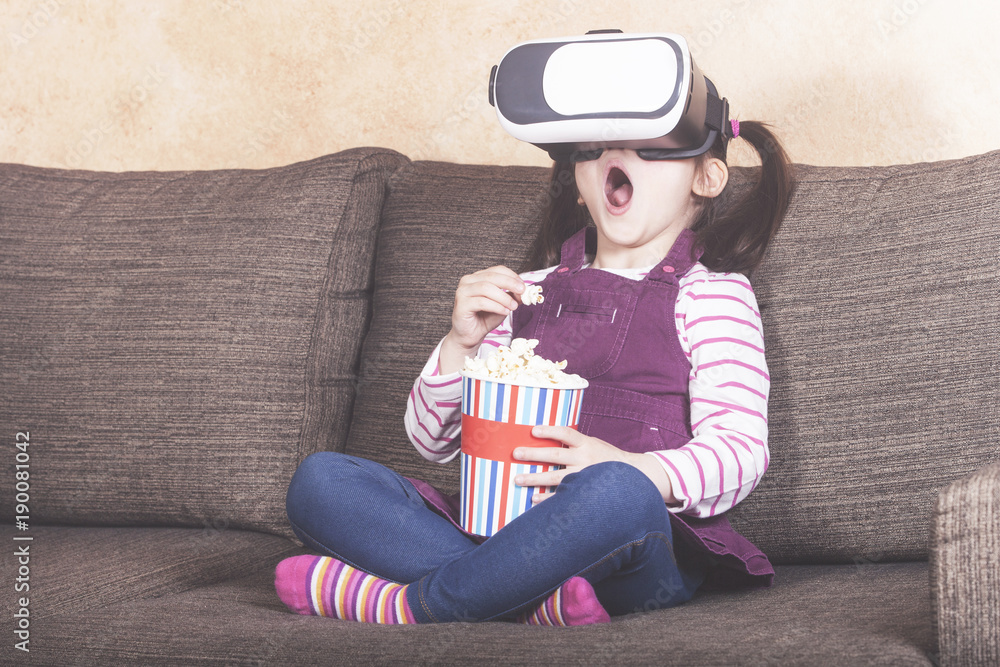 Excited little girl experiencing virtual reality at home