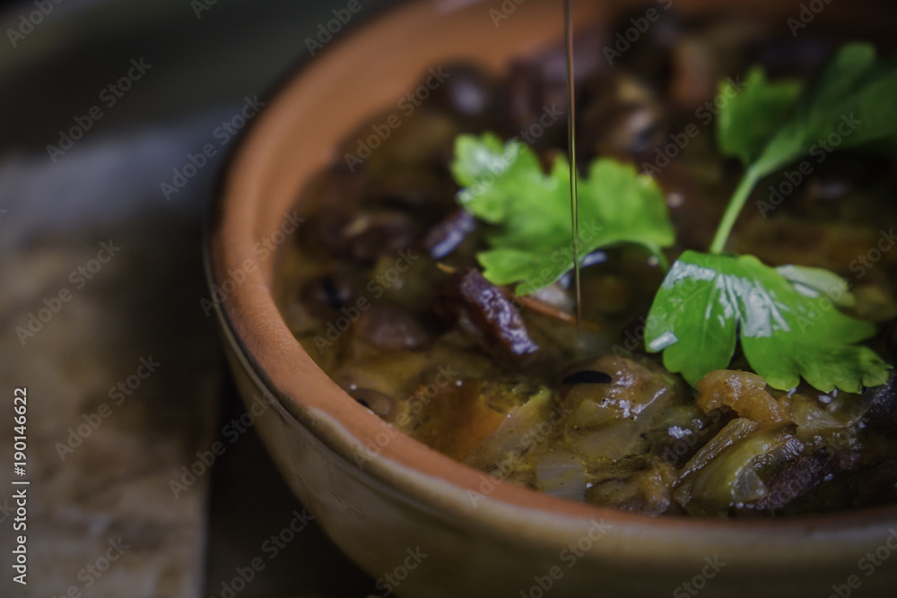 A close up color studio image of Egyptian Traditional food (Fava Beans) A.K.A (Foul) - Also served in Lebanon, Syria and most of Arabian countries specially middle eastern countries.