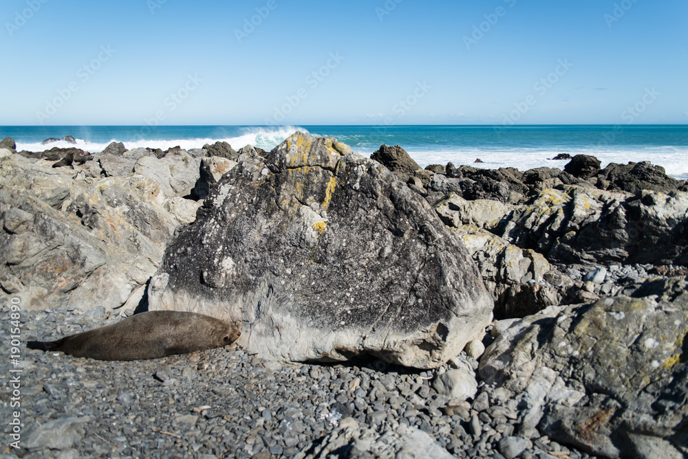 Seals on rocks by the ocean in Wellington, New Zealand.