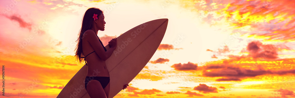Surfer bikini girl on Hawaii beach holding surf board watching ocean waves at sunset. Silhouette of Asian sport woman over landscape, sky and clouds background. Summer vacation lifestyle.