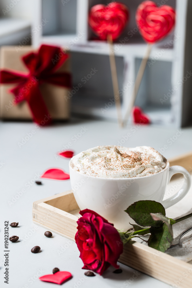 Fresh coffee for romantic breakfast Valentines day celebration with red rose and engagement setting, marriage proposal, gift box with satin bow, cappuccino with heart shape decoration, copy space