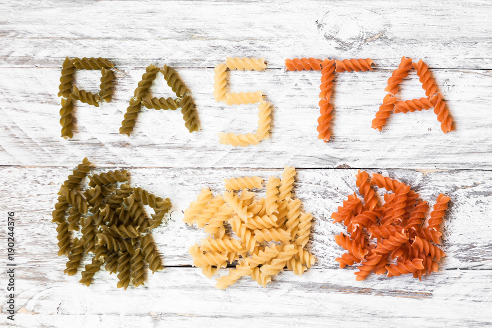 multicolored pasta on white wooden background