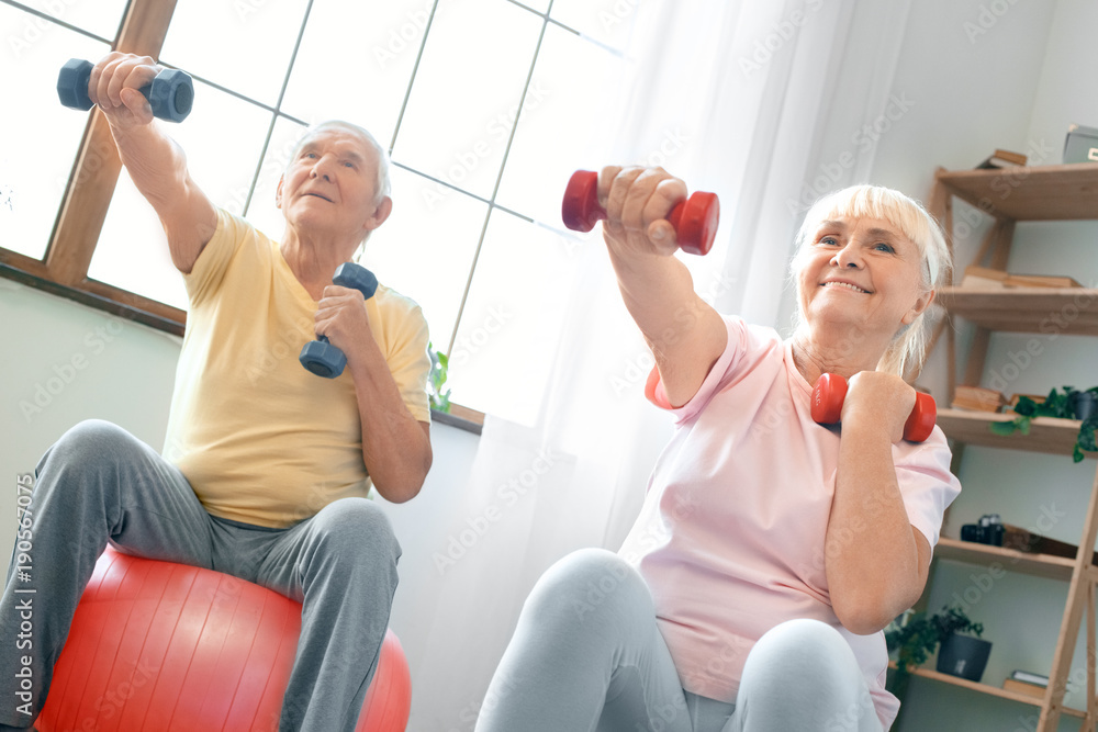 Senior couple exercise together at home doing aerobics with dubbells in front