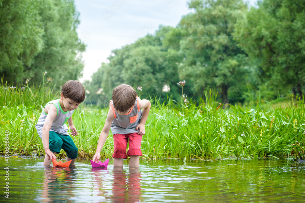 Two little brothers playing with paper boats by a river on warm and sunny summer day.