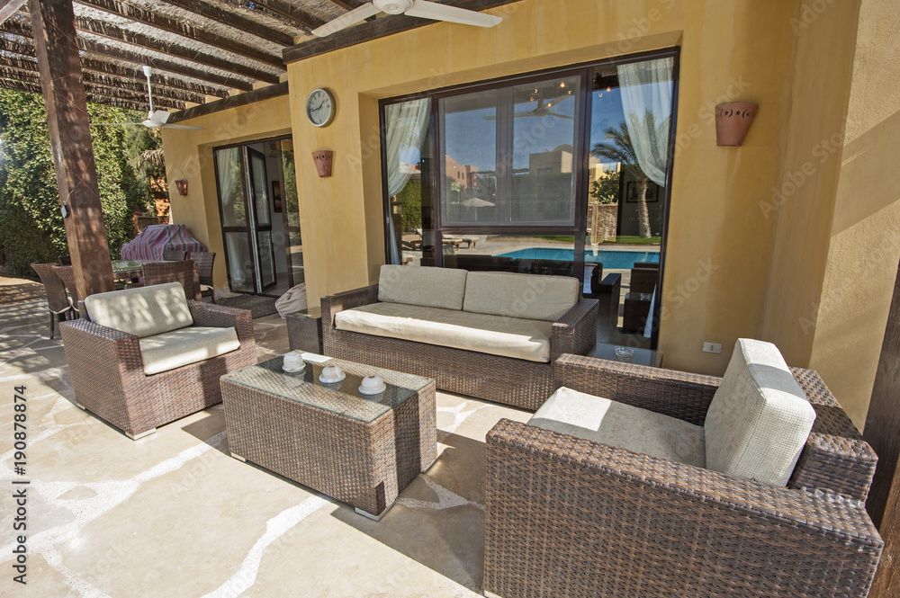 Patio area with sofa and table at a luxury tropical holiday villa resort