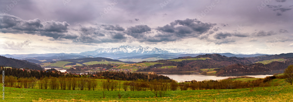 Panorama of spring snowy Tatra mountains. Lake and village behind high mountain range