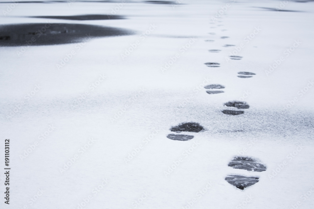 Winter foot steps in the snow on the ground