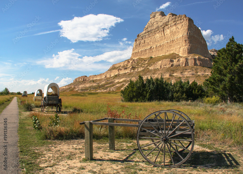 Path trail by Mitchell Pass with covered wagons at Scotts Bluff National Monument in Nebraska; part of the historic Oregon Trail, California Trail, & Mormon Trail.