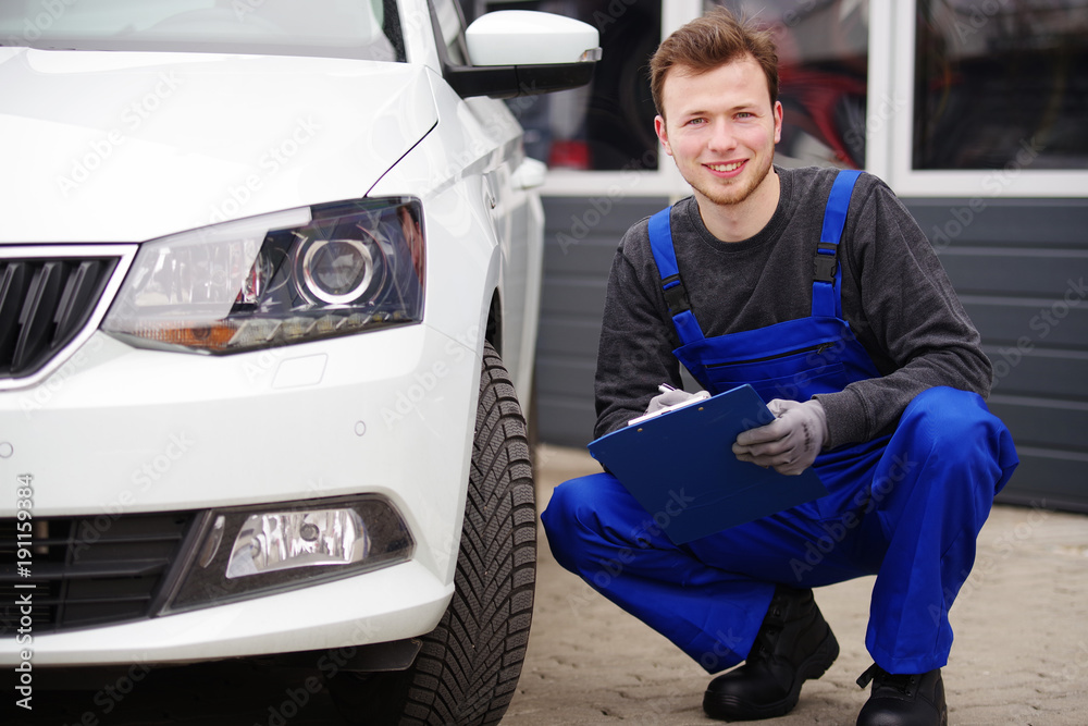 Mechaniker bei der Durchsicht eines Autos, TÜV-Untersuchung