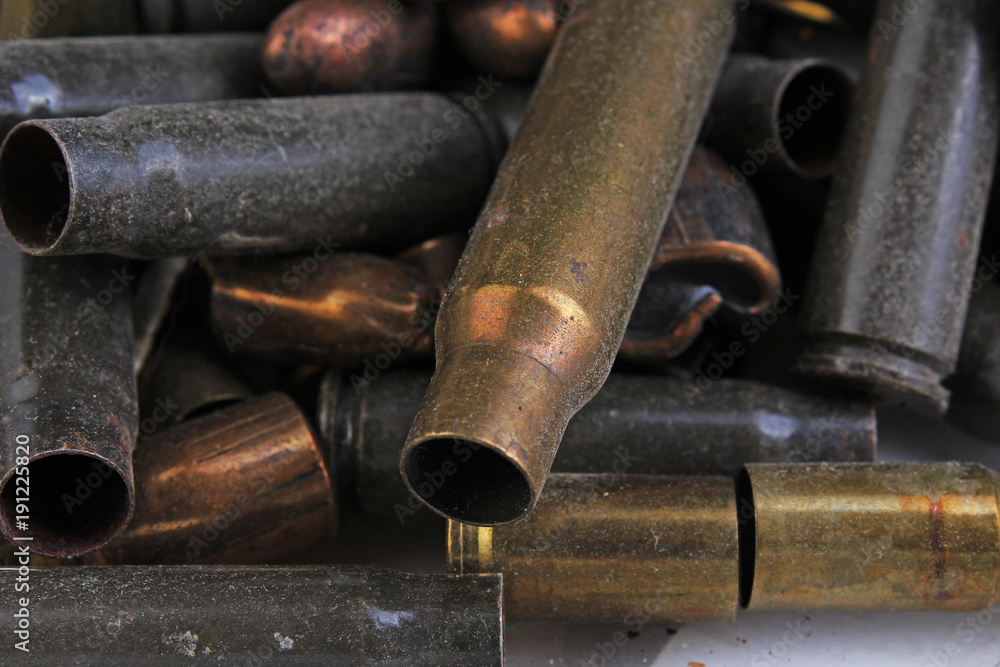 Heap of gun bullets. Weapon Cartridge case sleeve background texture, 7.65, and 9mm. Weapon cartridge sleeves.Gun bullet pattern close up.