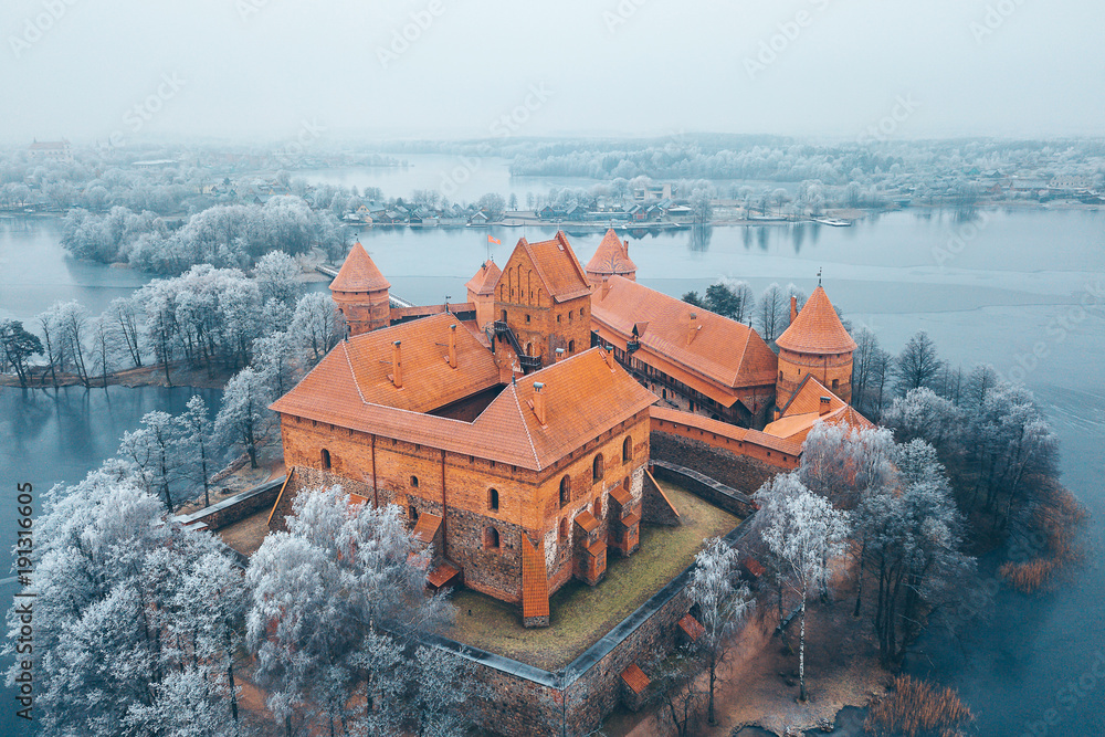 Trakai Island Castle, winter season, aerial view. History Museum.