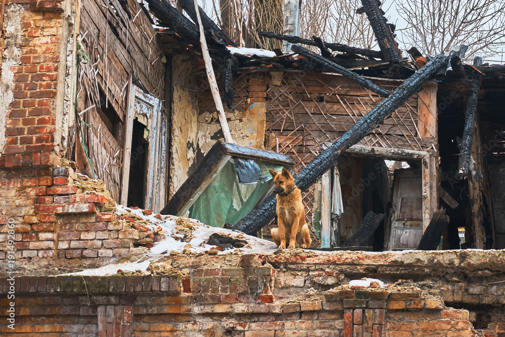 A faithful dog sits on the wall of an old destroyed house after a fire in the city