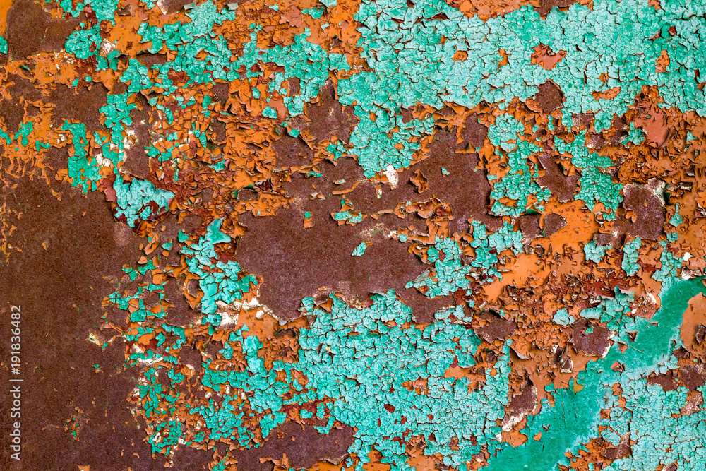 Old green paint on the metal and drips of rust. grunge vintage texture for background