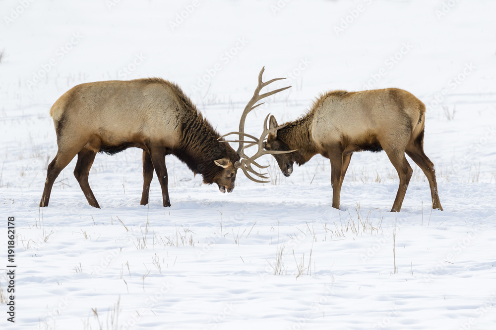 Males elk, or wapiti (Cervus canadensis) fighting in prairie on snow, Neal Smith National Wildlife Refuge, Iowa, USA.
