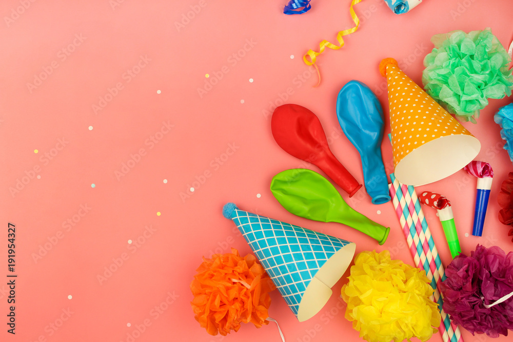 Holiday hats, whistles, balloons on pink background. Concept of children's birthday party.