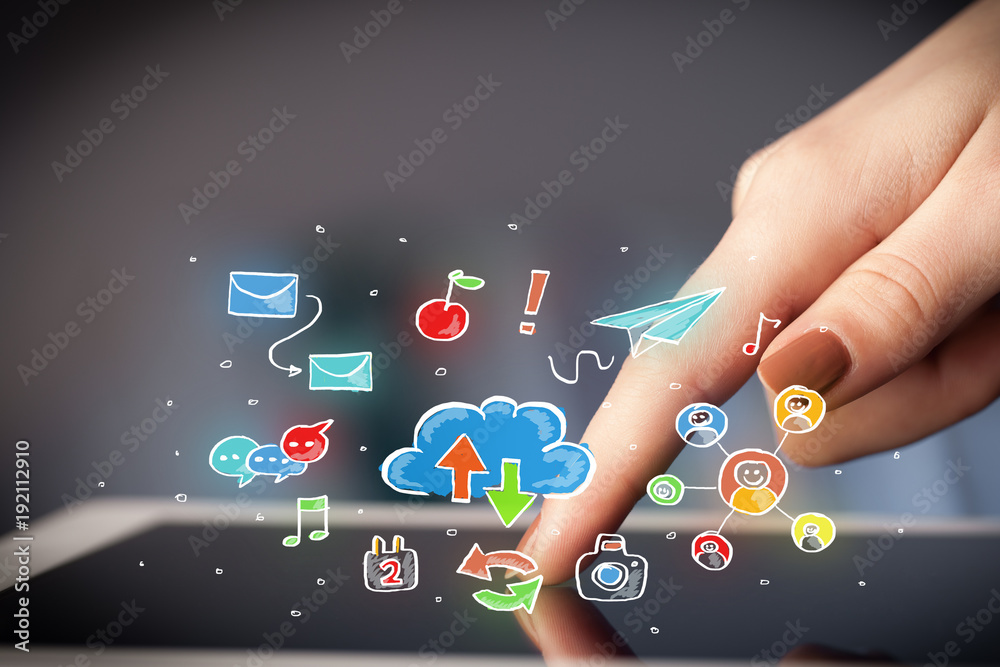 Fingers touching tablet with social icons