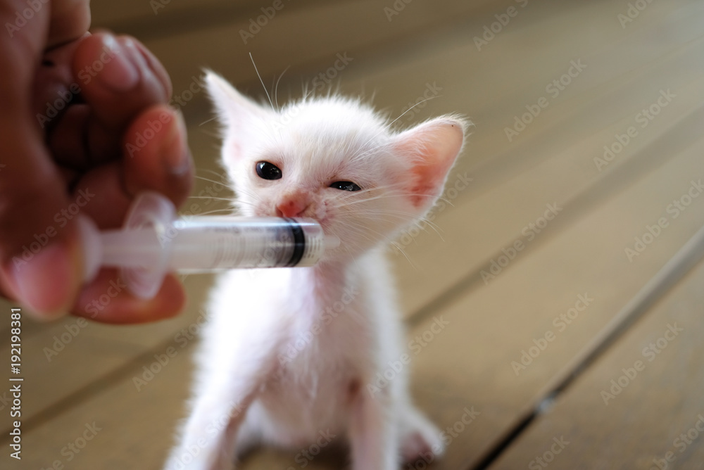 Hand-feeding a cute orphaned baby white kitten with milk replacer in a syringe, Thailand.