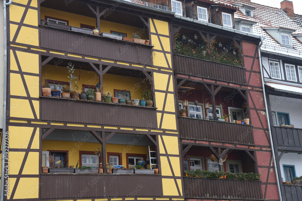 Fachwerkhäuser mit Balkonen auf der historischen Krämerbrücke