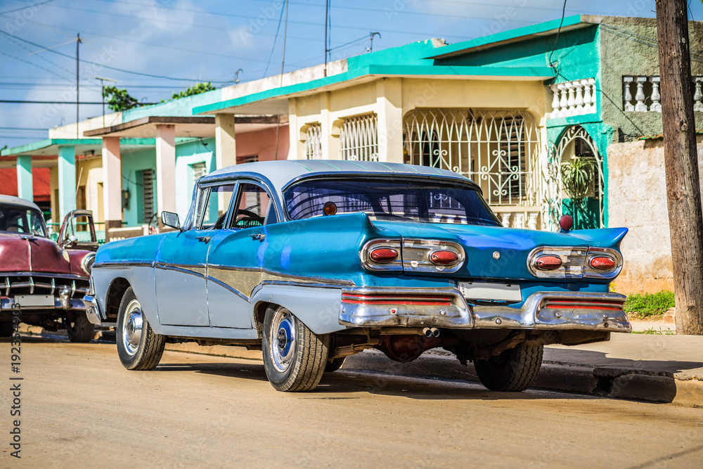 Blauer amerikanischer Oldtimer parkt auf der Strasse im Vorort von Havanna City Kuba - HDR - Serie Cuba Reportage