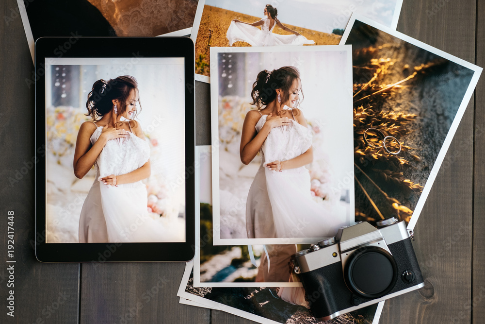 Printed wedding photos with the bride, a vintage black camera and a black tablet with a picture of bride