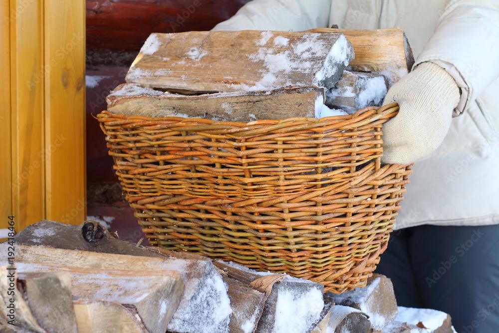 A wicker basket of firewood in the woman’s hands at the pile of birch firewood on the terrace of a country house in winter.