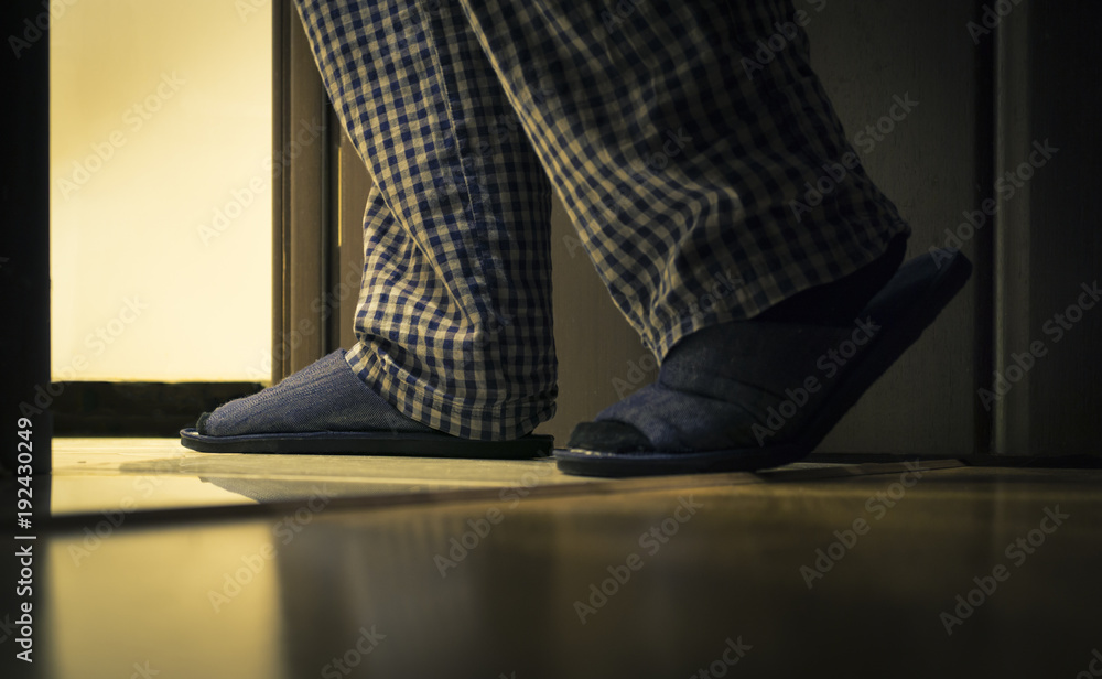 Adult man in pijamas walks to a bathroom at the night. Men's healths concept