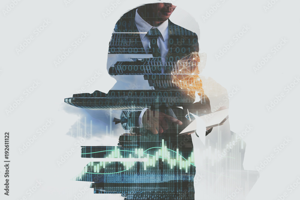 Double exposure of a businessman working.