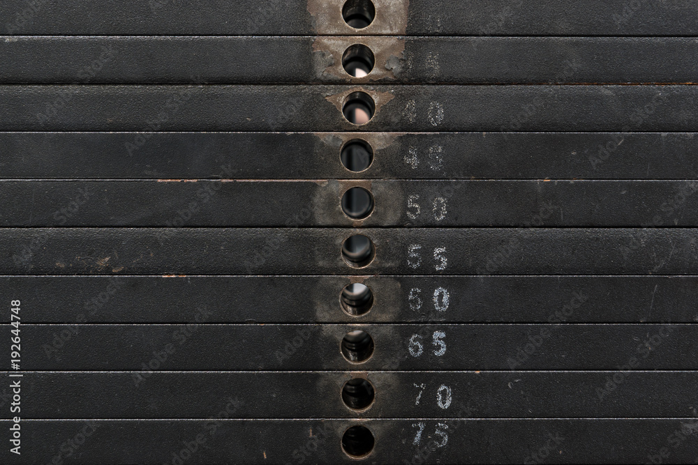 Old and used black weight stack with white numbers in a gym. Rusty flat metal weights.