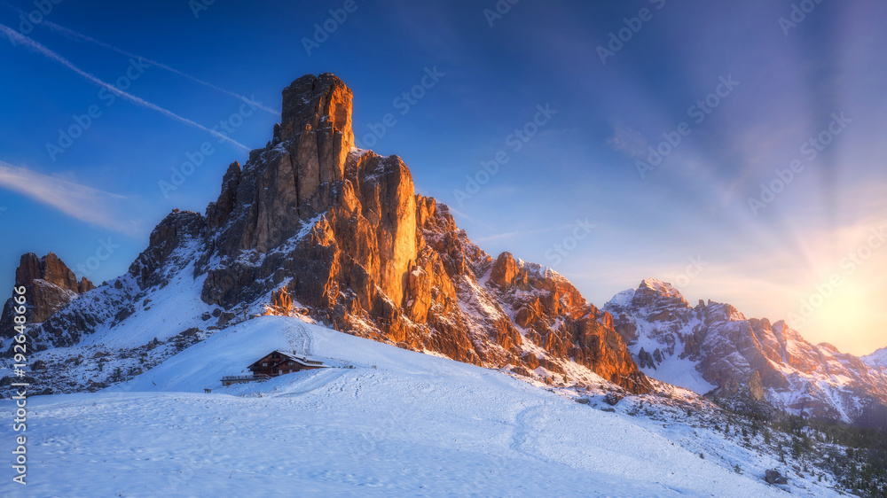 Fantastic winter landscape, Passo Giau with famous Ra Gusela, Nuvolau peaks in background, Dolomites, Italy, Europe