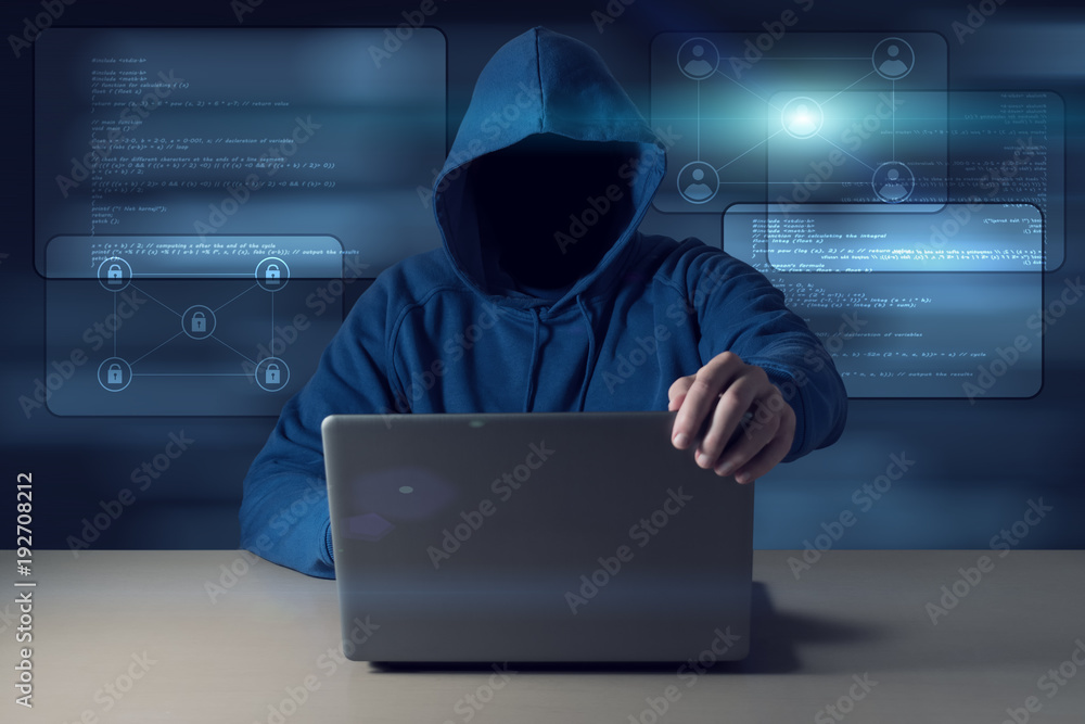 Computer hacker steals data from laptop. Theft of personal data and computer crimes