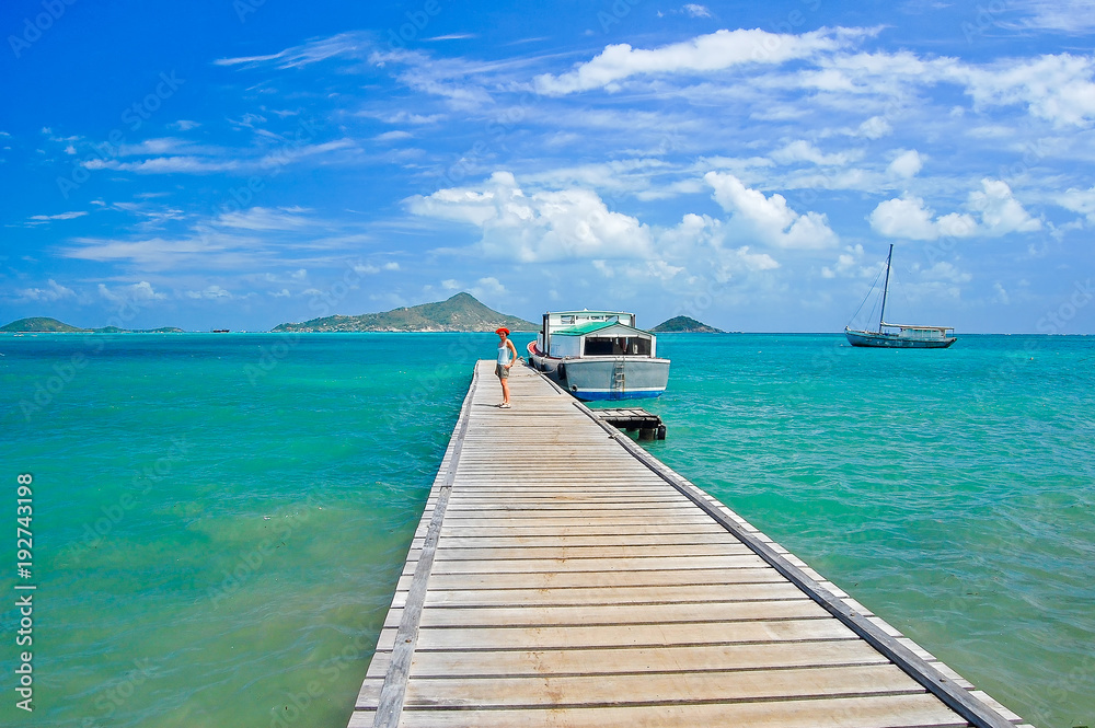 Young woman tourist on wooden jetty and beautiful Caribbean Sea, Carriacou Island