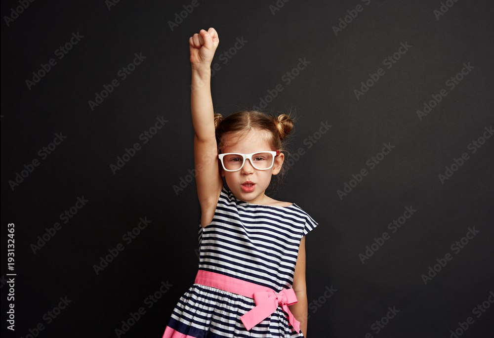 Cute girl wearing spectacles standing with hand up like superhero. Studio portrait of little child winning success.