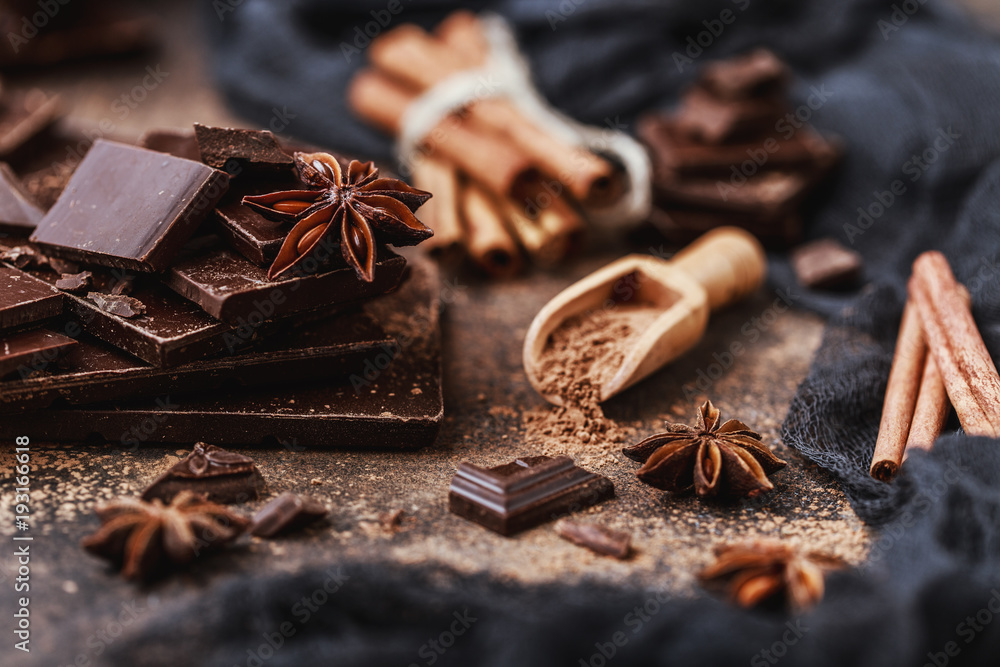 Chocolate bar pieces. Background with chocolate. Sweet food photo concept. The chunks of broken chocolate
