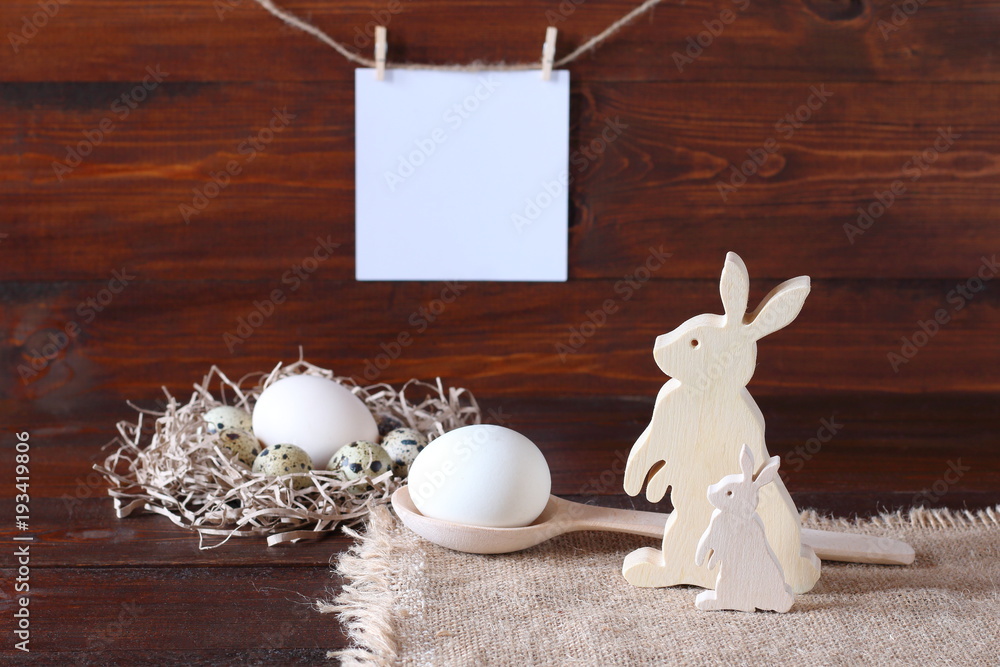 Easter composition with quail eggs and wooden figures of hares on a dark wooden background.