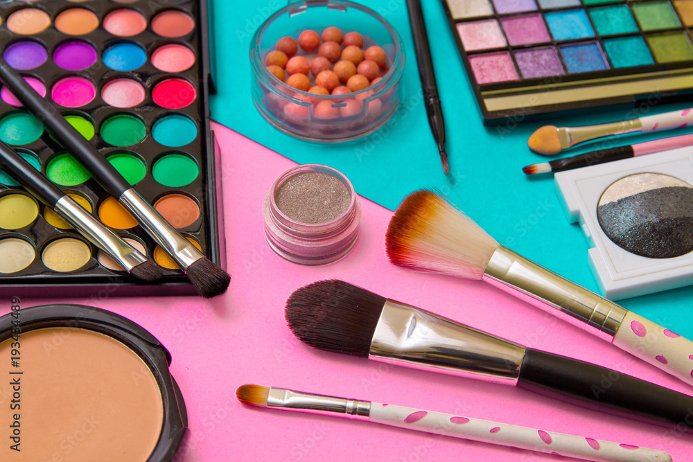 Brushes with an eyeshadow palette and lipstick in pink and turquoise geometric background. Decorative cosmetics for professional makeup. Eyeshadow colors trend.